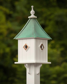 Dovecote style bird home features 4 compartments with 4 copper portals, (predator guards). With absolute precision and quality, it's constructed of cellular expanded PVC. Post-mounted birdhouse is guaranteed to last with little to no maintenance. Lift off roof for easy nest clean-out.